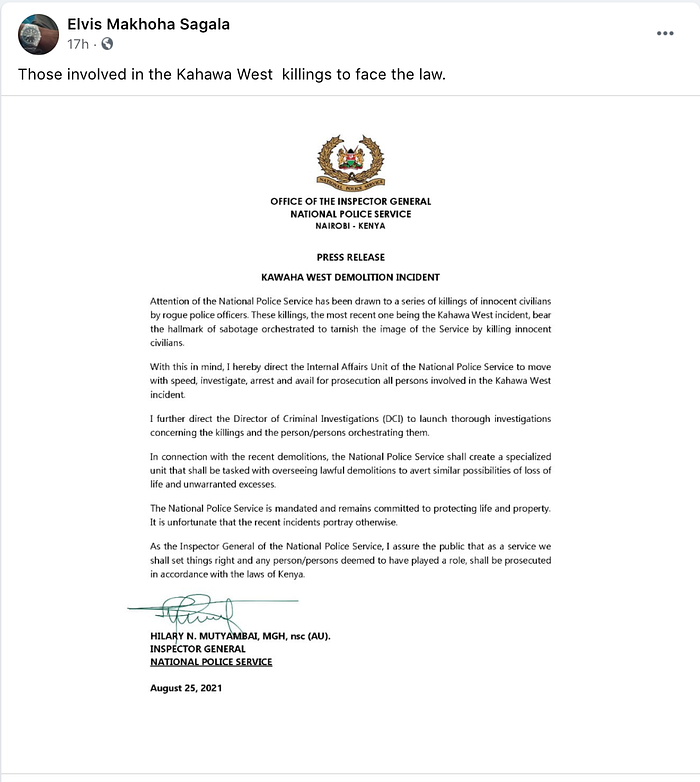 PesaCheck has looked into a press release shared on Facebook purportedly from the Inspector General of Police, Hilary Mutyambai, condemning the Kahawa West demolitions and finds it to be FAKE.